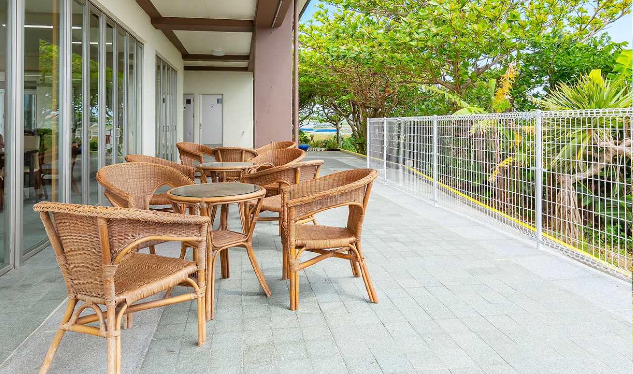 空調完備の休憩室横のテラスも完備、自然の風の中、ゆっくりお寛ぎください。