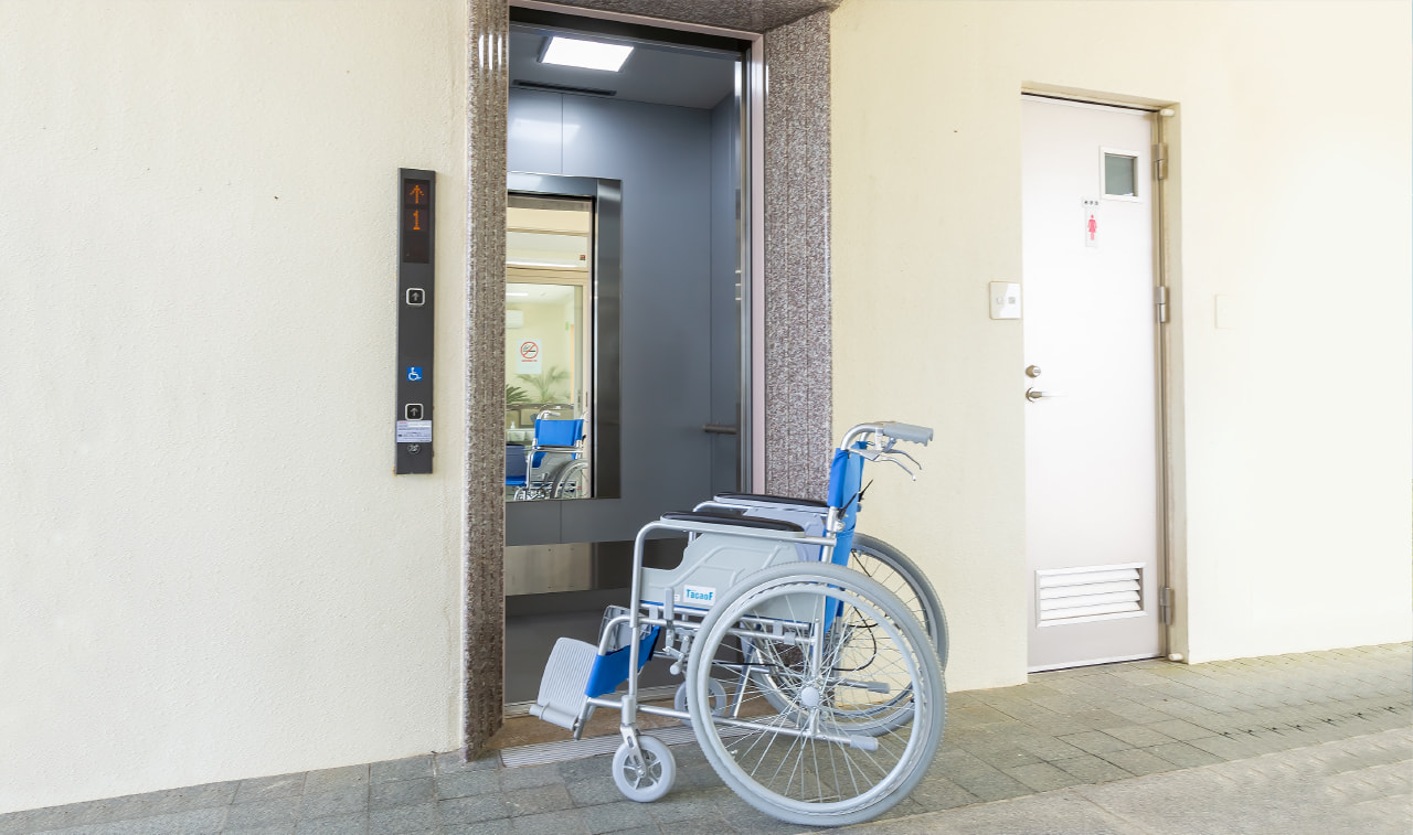 管理棟は、エレベーターに至るまで 全バリアフリー設計、車椅子の方も安心です。